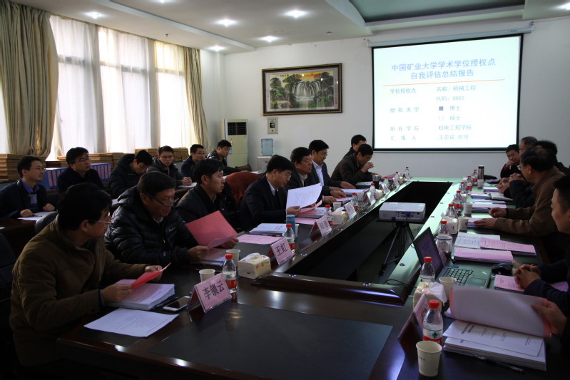 校长葛世荣代表学校致欢迎辞。校学科建设处岳建华处长主持会议并介绍了评估专家组成员、我校学位授权点合格评估筹备情况和评估相关要求。王忠宾教授、肖兴明教授和李威教授代表学院分别进行了机械工程一级学科博士学位授权点、机械工程领域工程硕士专业学位授权点以及仪器仪表工程领域工程硕士专业学位授权点的自我评估总结汇报。