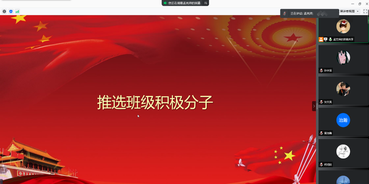 9月27日,机器人工程2019-2班于线上举行积极分子评选与发展对象党外测评,班长黄治瀚和团支书孟亮泽主持会议,全班同学出席会议。