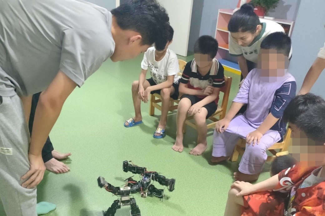 队员与特殊儿童们的互动中专注力这一内容得到了很好的锻炼,有些小朋友主动向负责展示机器人的同学询问关于机器人知识,并在队员的指导下操作机器人。