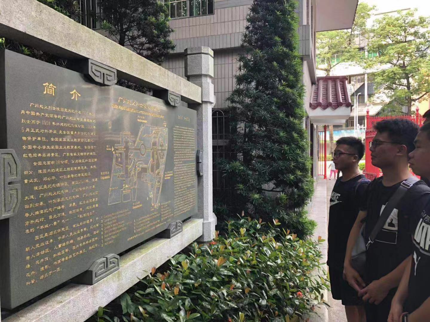 8月10日,由蔡智昊同学带领的“缅怀先烈,不忘历史”暑期实践团开始了以“瞻仰烈士墓,铭记红色精神”为主题为期两天的社会实践。此次活动的目的是通过对园区内图画以及文献的参观来对当年所发生事件的大致了解,以便于团员们更加深刻地体会到当时情况而更加坚定地铭记和传承这一份“红色精神”。在广州起义烈士陵园,陵区建筑庄严肃穆,绿化以苍松翠柏和红花为基调,其中苍松翠柏多象征卫士,红花象征烈士们的鲜血;园区则是典型的岭南园林风格,以清新淡雅的绿化配置和园林造景为特色,吸引了不少老年人到那里去晨练、聚会聊天。进入周恩来题写了“广州起义烈士陵园”八个金字的阙门,经过墓道便是象征着“枪杆子里出政权”的广州纪念碑,团员们献上带去的献花,事后参观瞻仰以及高耸的圆墓并鞠躬致敬。