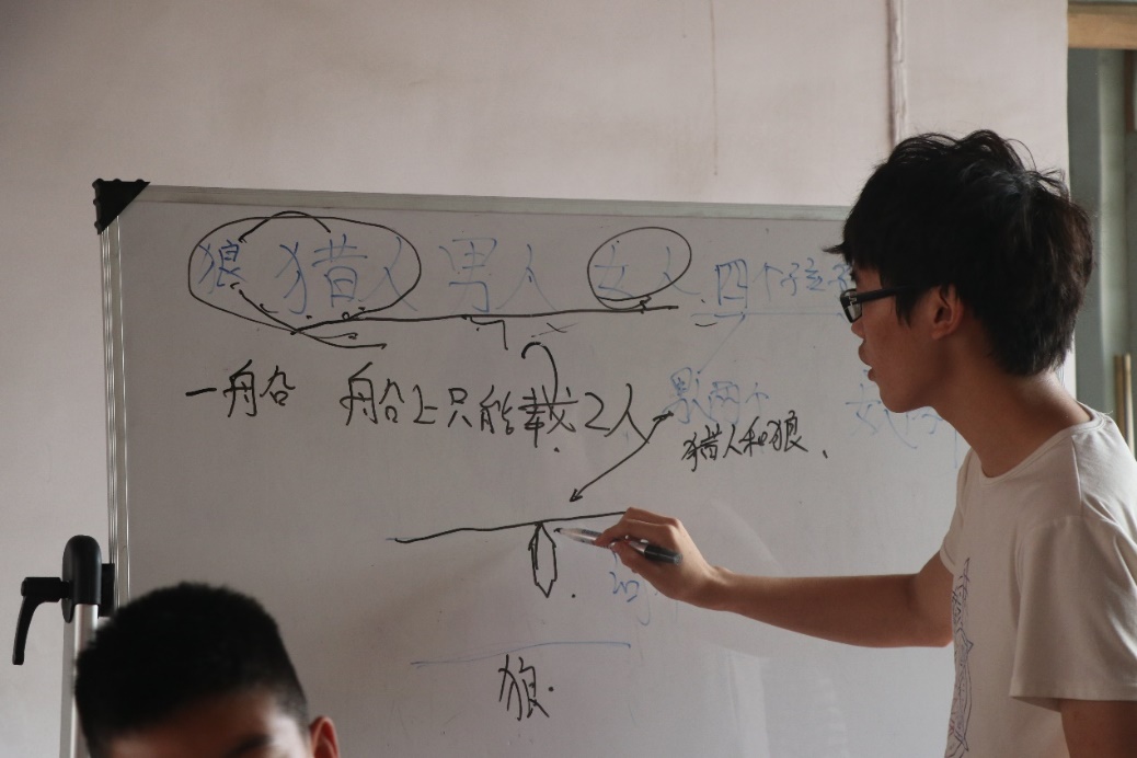 7月17日下午,在短暂的午休后,第一节手语课正式开始。“青”心支教团手语课的负责人带领孩子们复习上节课《爱因为在心中》的动作,经过一系列的手语动作复习,孩子们对于手语动作的掌握变得越来越熟练。同时在手语课上孩子们积极展示自己,在手语老师的带领下越来越投入。随后,下午第二节趣味数学课正式开始。“青”心支教团趣味数学课的负责人提问有关于“狼”、“猎人”、“男人”、“女人”、“孩子”一起过河的问题,这大大引起孩子们的兴趣,锻炼了他们的逻辑思维能力,提高了团队合作、动手动脑能力。课上孩子们积极思考,热烈讨论,学习氛围很浓厚。课后,趣味数学老师给孩子们留下了课后题,等到下节课让孩子们一起讨论。最后,“青”心支教团负责人李科表示:“希望通过这节趣味数学课能让孩子们真正的喜欢上曾经令他们头疼的数学课。