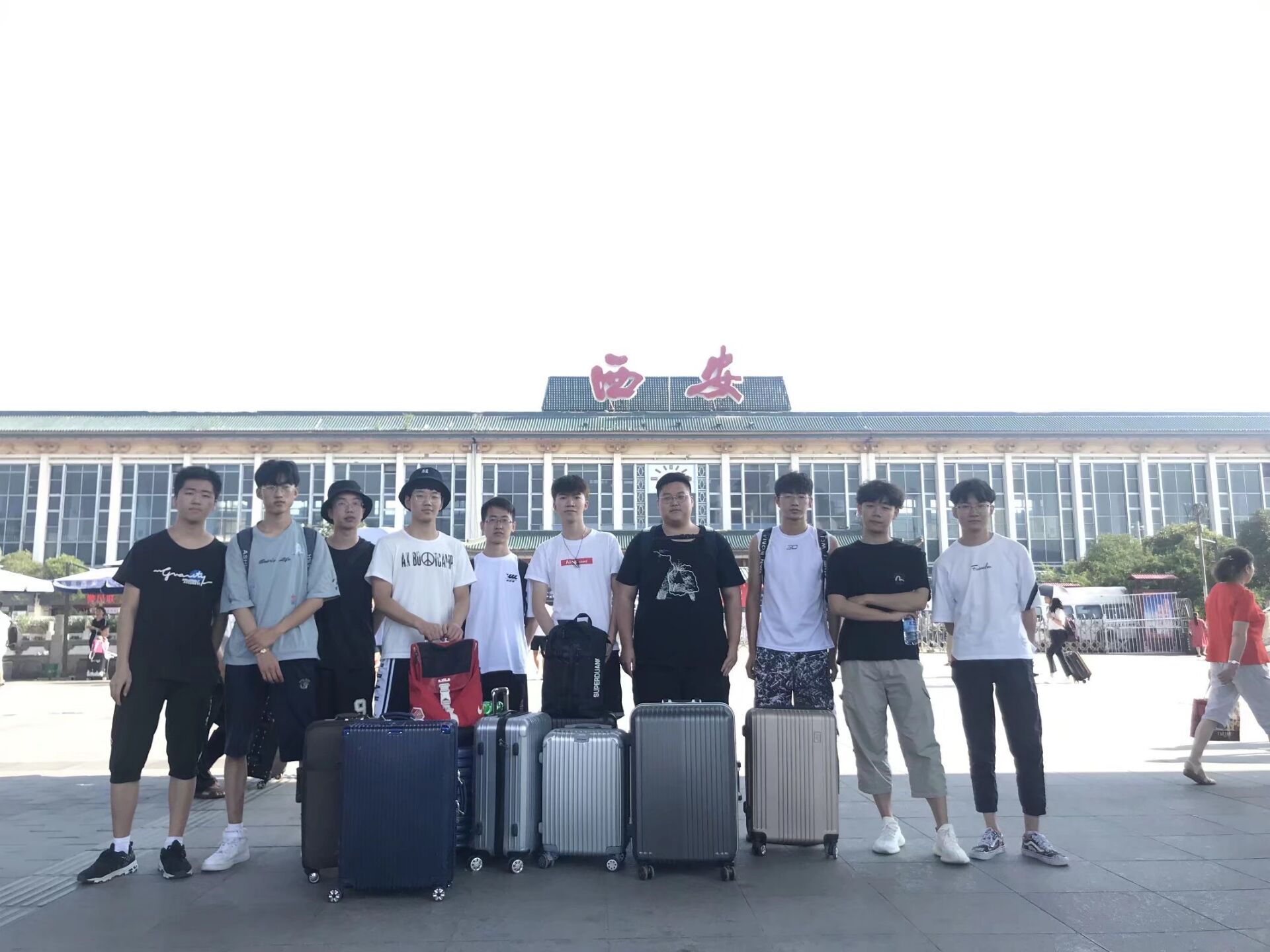 7月14日中午无码动漫 九班西安暑期实践团来到了目的地——陕西西安,迎面感受到的是西安的高温闷热,炎炎的烈日似文化古都厚重底蕴。实践团队到达目的地后即在西安火车站前进行了合影留念。