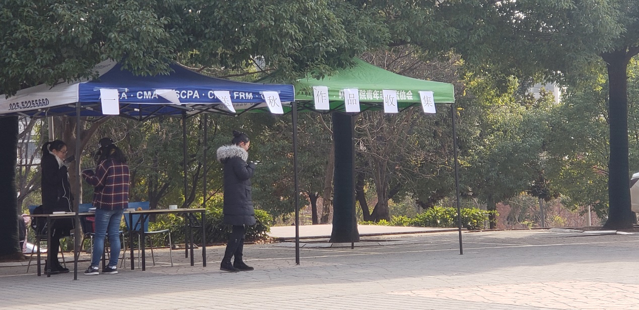 12月8日,迎着凛冽的寒风,志愿者们在各个食堂扎好了帐篷收取活动作品。随后,参与的学生也陆陆续续交来了他们用心制作的作品。有的学生选择用落叶拼出极具创意的图案;有的选择把精心挑选的落叶做成明信片,既美观又实用;有同学选择将黄叶做成了手工艺品,其手工能力可见一斑。