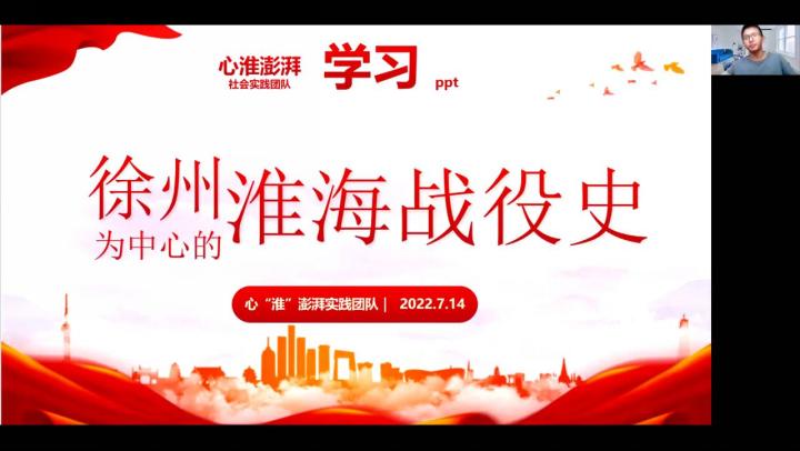 谢真同学根据团队所确定的采访大纲,为方便在线上有更好的采访效果,精心准备了采访用的PPT。在询问过被采访人的意愿后,通过腾讯会议的方式进行线上面对面采访。采访问题涉及对淮海战役的了解程度,对红色资源开发的建议等。被采访者深刻的描述了自己对那段惊心动魄的历史的深刻了解以及内心感受,并对于更好地促进人们学习党史、铭记先烈提出了自己的观点与看法与大家讨论。通过本次采访,团队成员们真切地了解到了人民群众,特别是当代大学生对淮海战役等红色历史的热爱及学习情况,并表示这样的学习更加促进自己的爱国情怀。