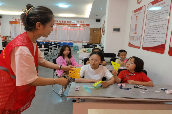 8月16日下午,团队成员提前到活动室布置场地,组织参与活动的中小学生签到就坐。先进行宣讲部分,后与孩子们一起动手,不仅进行了剪纸活动,还参与了制作簪子、发饰等手工活动,能更好加深孩子们对活动的印象,与对活动意义的理解。活动全程由社区负责人拍照协助。