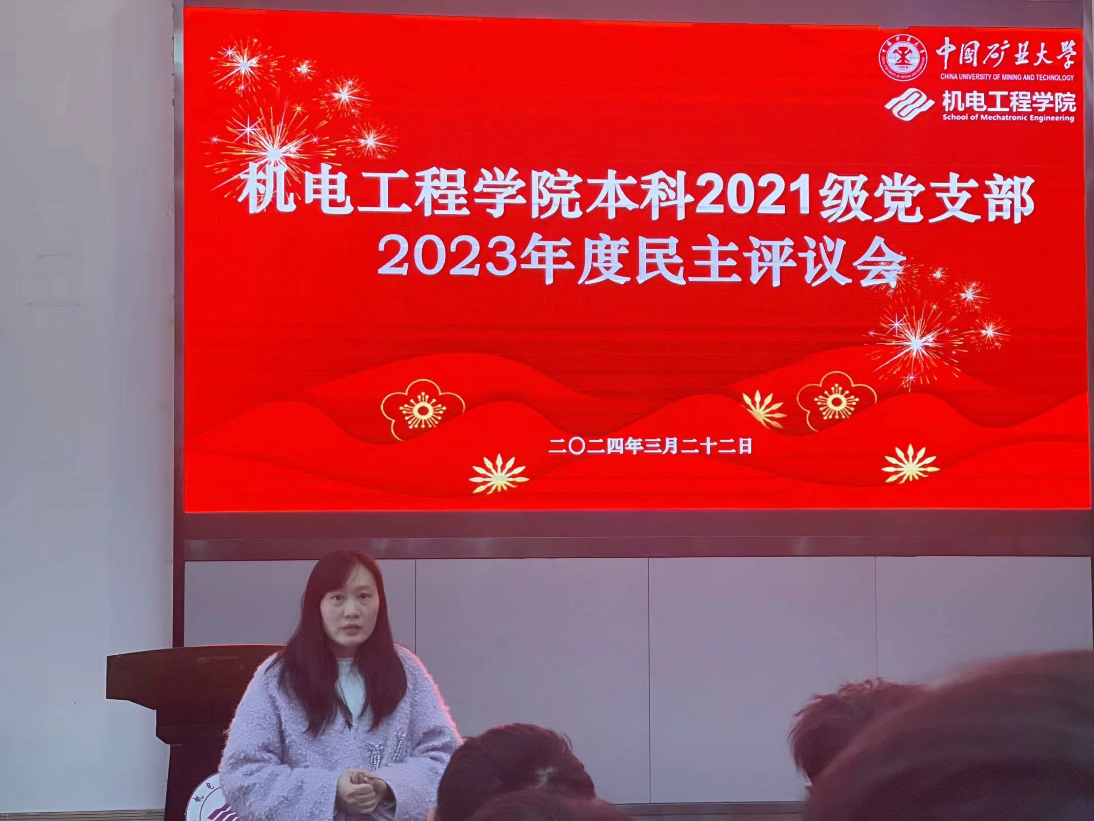 为根据党员2023年全年综合表现,实事求是地对每名正式党员进行测评和考究,2024年3月22日下午,无码动漫 本科2021级党支部在B110报告厅举行2023年度民主评议会,2021级党支部书记邓燕飞、兼职辅导员马玉以及2021级全体党员参加了本次会议。
