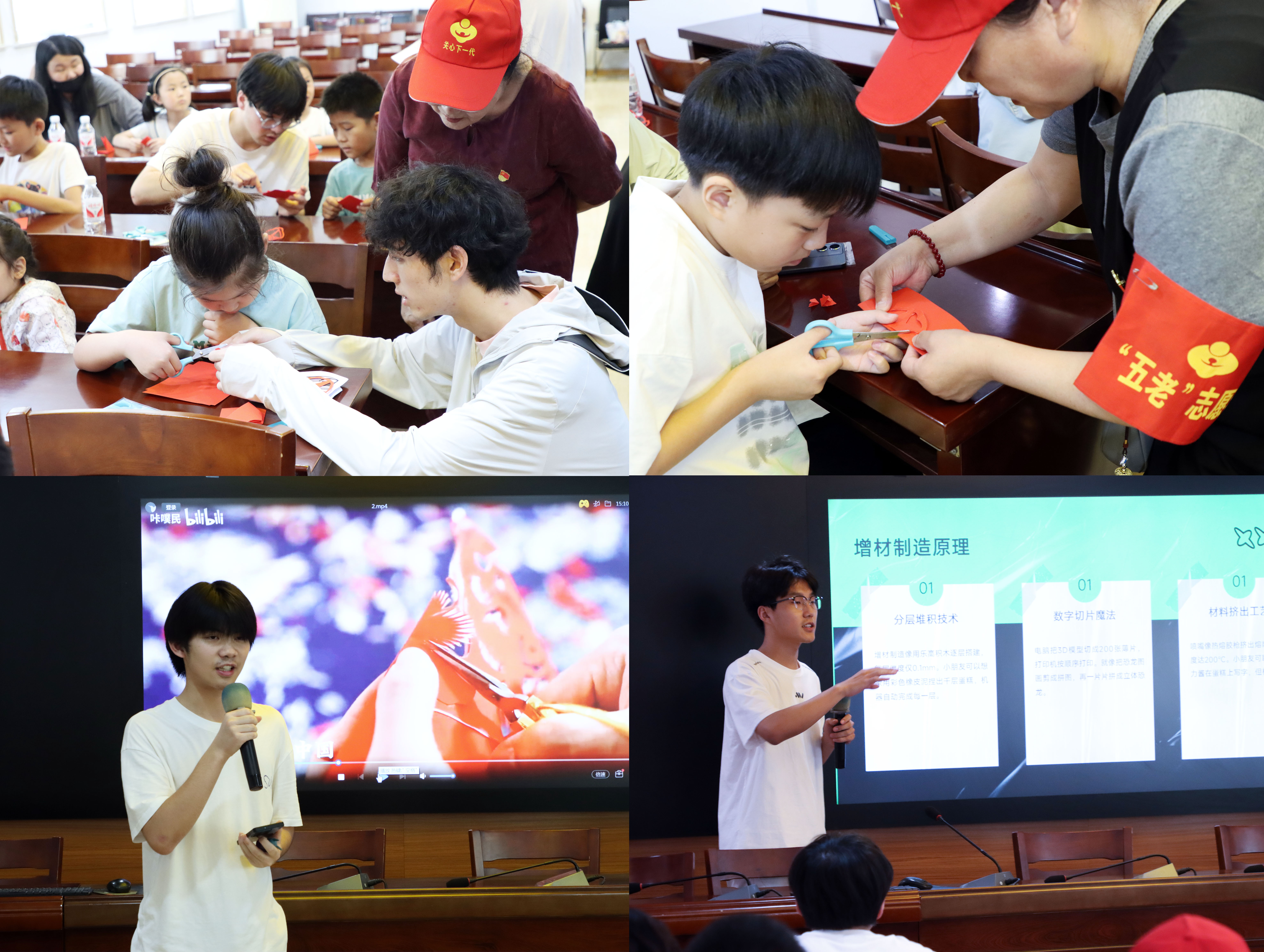 本次活动由志愿者面向下淀社区招募的初中生开展党史教育与科普活动。首先,通过党史教育短片,讲解中国共产党成立纪念日的历史背景,视频内容生动展现了党的光辉历程和伟大成就;随后,进行工程图学基础知识和AutoCAD软件操作讲解,志愿者通过现场演示帮助中小学生理解制图原理,并组织剪纸实践活动,将传统工艺与现代设计理念相融合;最后,结合视频演示和互动环节,科普三维建模和3D打印技术知识,让中小学生直观感受先进制造技术的应用场景。