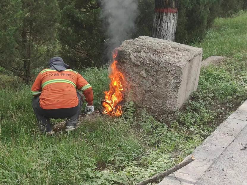 工作开始阶段,养路局工作人员向团队讲述了道路维护的几个重要环节,分别是道路表面灰尘清理、压碎石、碎石分层、浇筑沥青、平整、收尾。随后,团队在工作人员的帮助下,完成了清灰、碎石分层以及焚烧沥青滤网的工作。